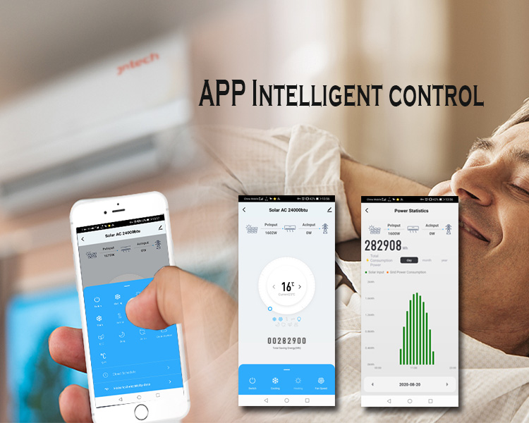 Solarklimaanlagen werden direkt mit Solarenergie und Netzstrom betrieben, eine Batterie ist nicht erforderlich. Wenn die Sonne scheint, werden sie vollständig durch die Solarquelle mit Strom versorgt; wenn die Sonne schwach ist, werden sie durch Solarenergie und Netzstrom gleichzeitig mit Strom versorgt. Das gesamte System mit Hybriddesign kann online mit Solar- und Netzstrom betrieben werden.